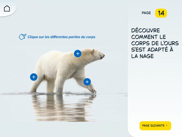 Grâce à un système de navigation intuitive, l'application permet d'accéder à des contenus exclusifs directement liés aux pages de la BD : vidéos tournées en expédition, photographies des milieux polaires, mini-jeux éducatifs et informations complémentaires sur l'ours polaire. Les symboles d'ours dispersés dans la bande dessinée servent de repères pour découvrir ces enrichissements numériques.