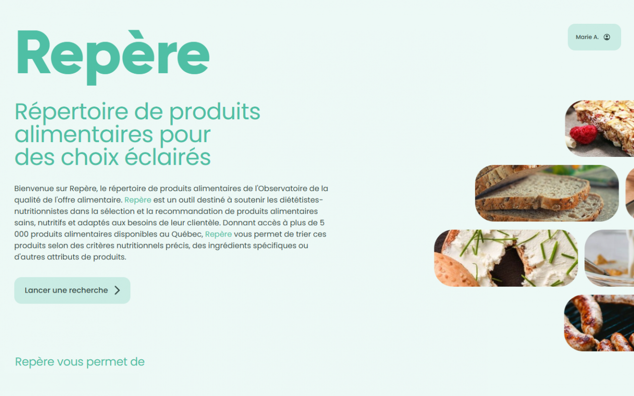 Repère est un outil pratique qui réunit plus de 6 000 produits alimentaires offerts au Québec. Conçu pour et avec l’Observatoire de la qualité de l’offre alimentaire, il aide les diététistes-nutritionnistes à repérer rapidement les produits les mieux adaptés aux besoins de leur clientèle.
